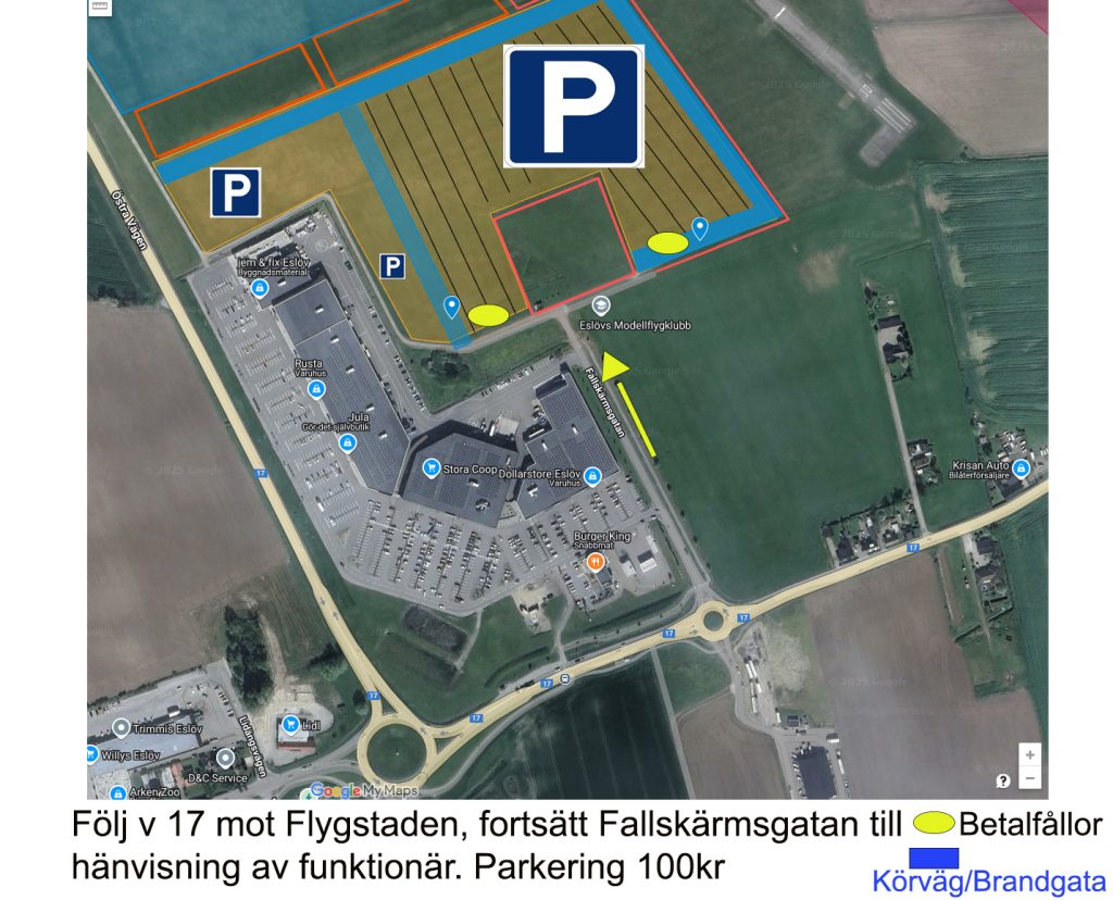 Kör Fallskärmsgatan ner till våra funktionärer som möter upp. Parkering kostar 100:- / Swish eller kontant (parkeringsavgiften går till föreningsverksamheten). Parkeringen öppnar kl 08:30
